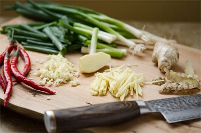 Bước 1: Sơ chế các loại rau củ: hành lá thái thành từng cọng dài khoảng 3 đốt ngón tay, gừng tươi cạo vỏ thái lát, ớt tươi cắt đầu, tỏi đập dập băm nhỏ.