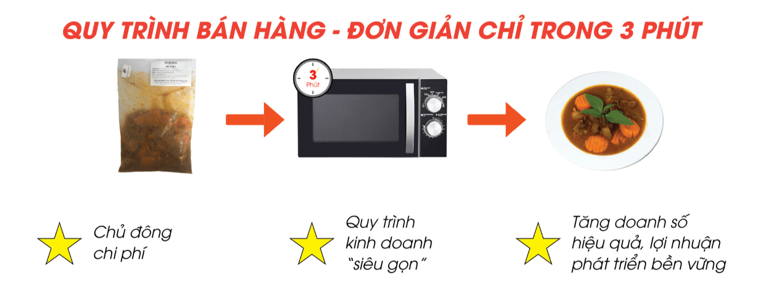 Chỉ trong 3 phút đã sẵn sàng mọi thứ phục vụ thực khách, bạn chỉ cần cho sản phẩm vào lò vi sóng chờ trong 3 phút “ting ting” là có ngay món ngon nóng hổi vừa thổi, vừa ăn rồi. Tiết kiệm thời gian và nhân sự cho mô hình kinh doanh của bạn.